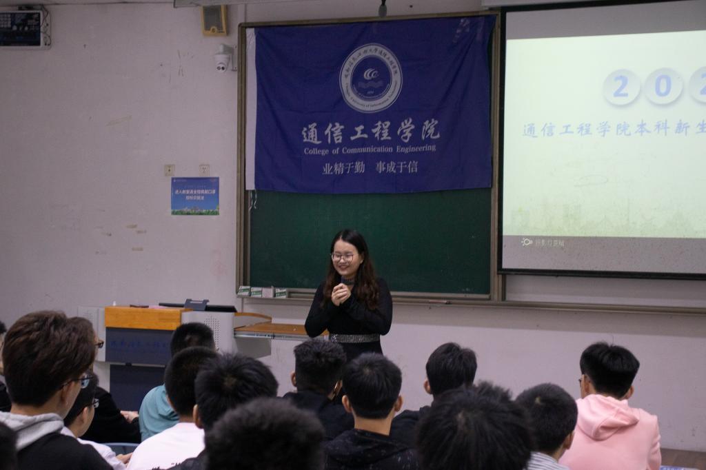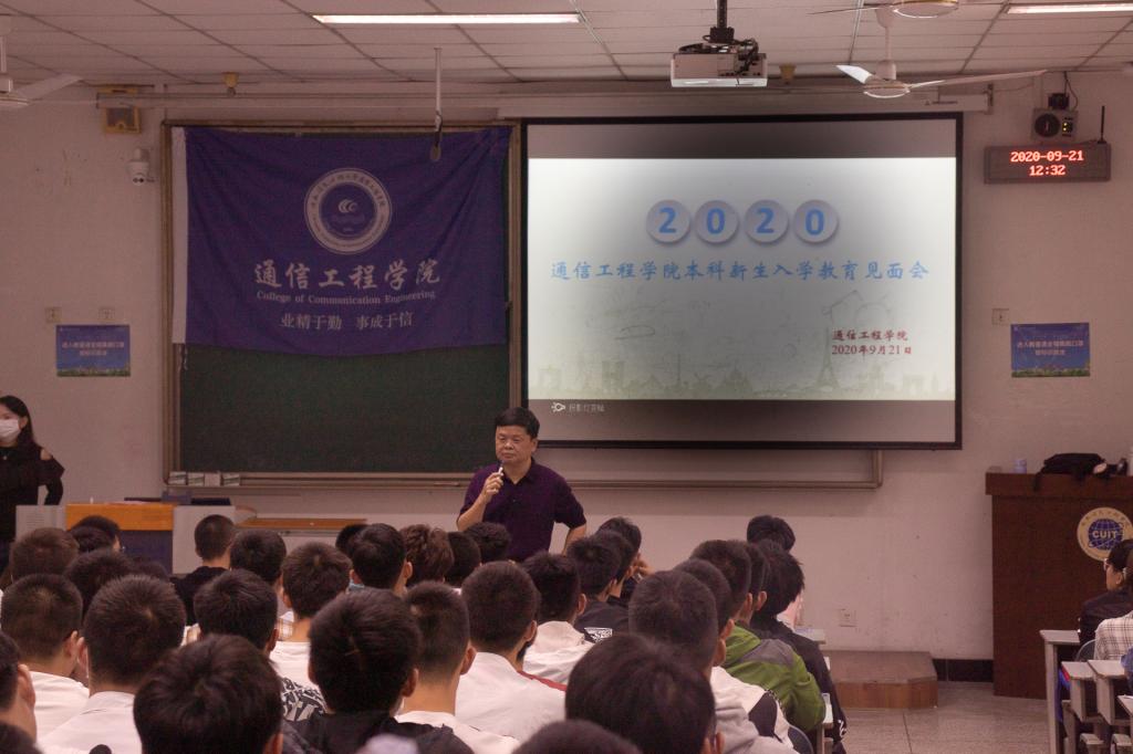 2020年9月21日中午,通信工程学院2020级师生在第一教学楼1102教室召开了本科新生入学教育见面会,学院分党委书记刘绍全,学生科科长邵璐,学生科副科长兼院团委书记彭靖涵,2020级本科新生辅导员翟静波及全体2020级本科新生参加了此次见面会。