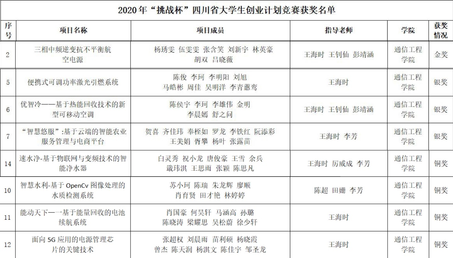 在本次大赛正式公布的获奖名单中,成都信息工程大学共15支队获省奖,通信工程学院占8席,占比 53%(获奖超全校一半)。其中,省金奖全校共3个,通信工程学院占1个,占全校33%;省银奖全校5个,通信工程学院3个,占全校60%;省铜奖全校7个,通信工程学院4个,占全校57%。