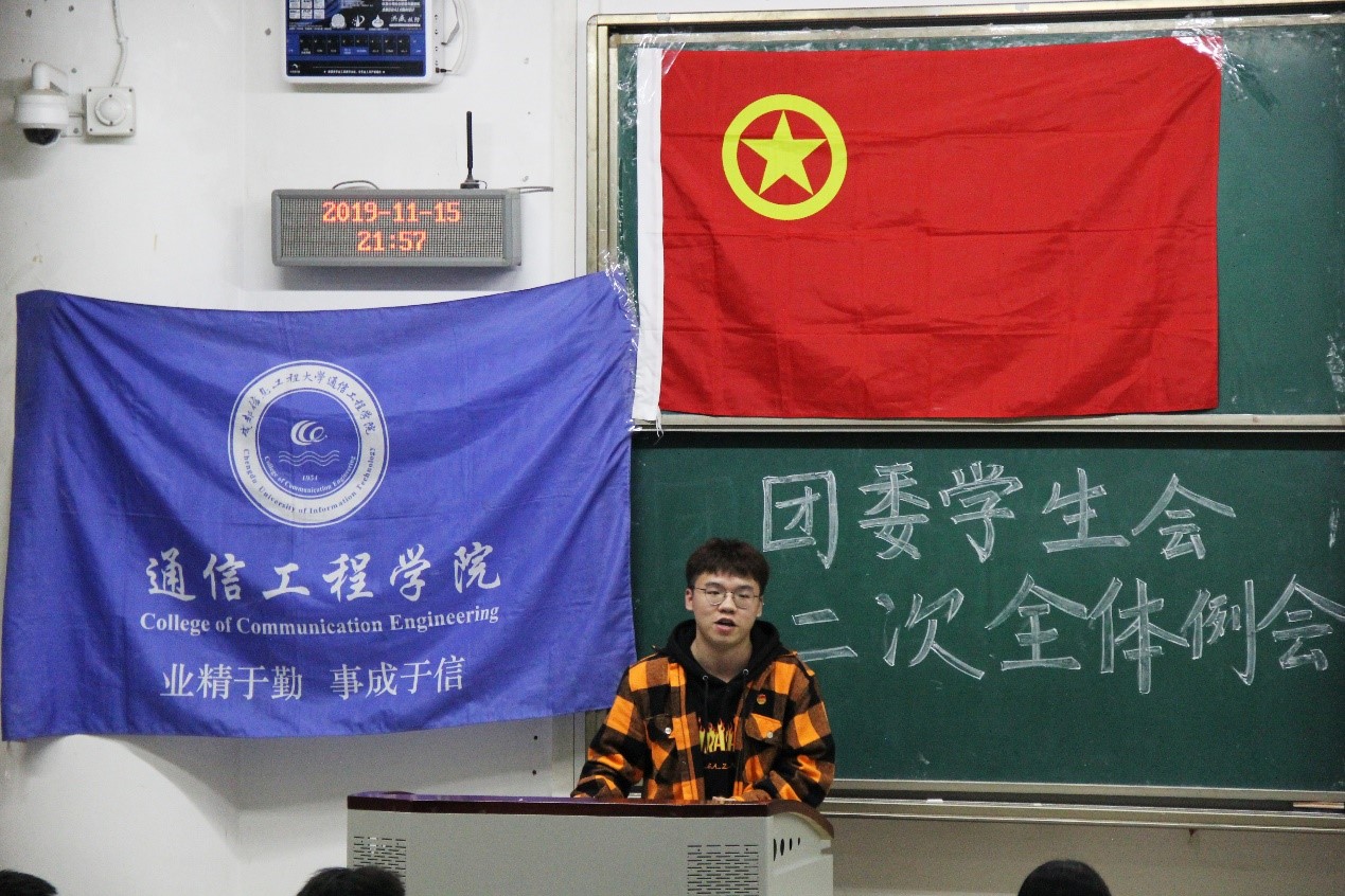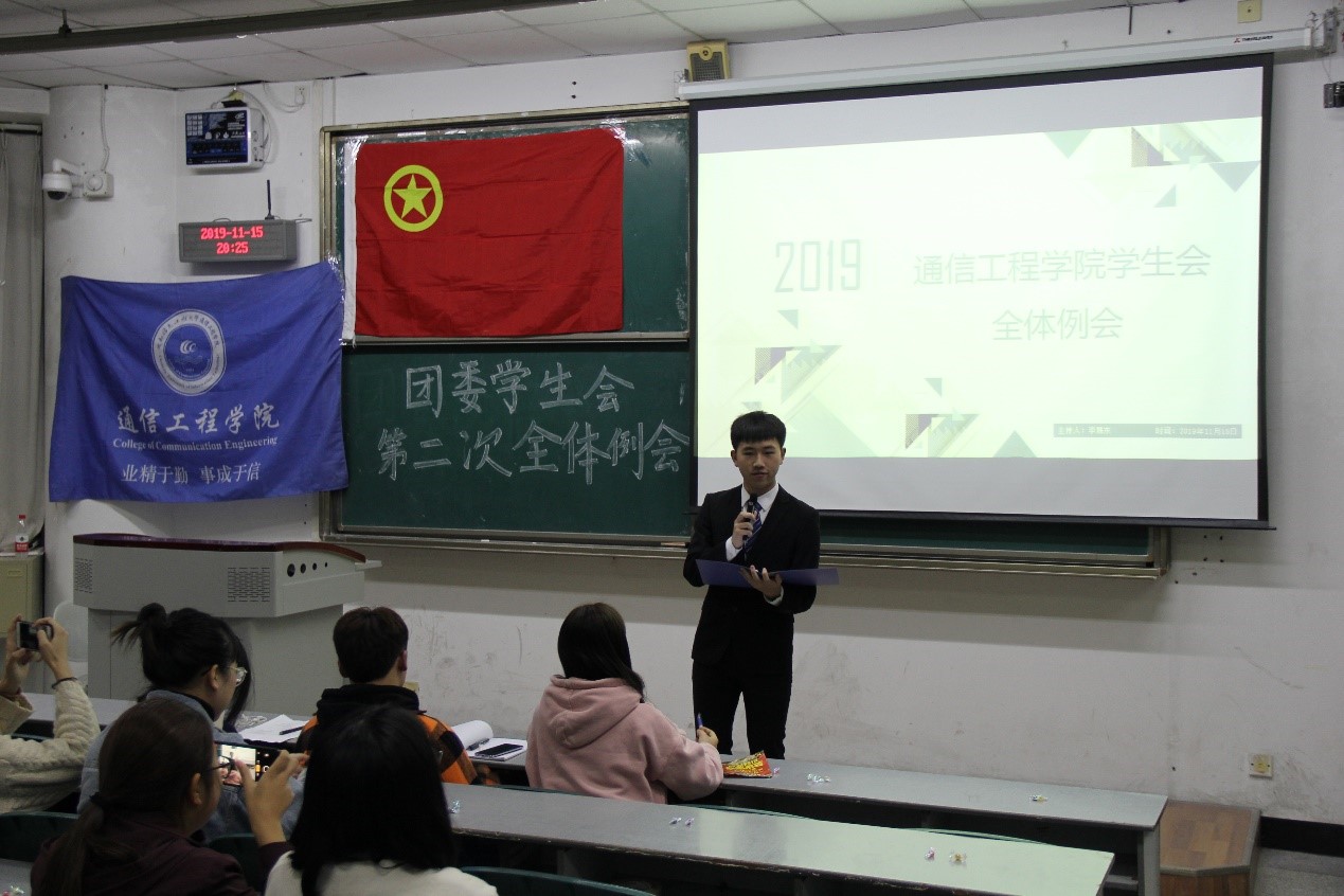 2019年11月15日晚八点半,通信工程学院(微电子学院)团委学生会于4112教室召开第二次全体例会。本次例会旨在总结各部门在本月内所做工作及做出反思,同时明确下个月目标。出席本次会议的为团委学生会全体成员。本次会议由社团工作部李晟东主持。