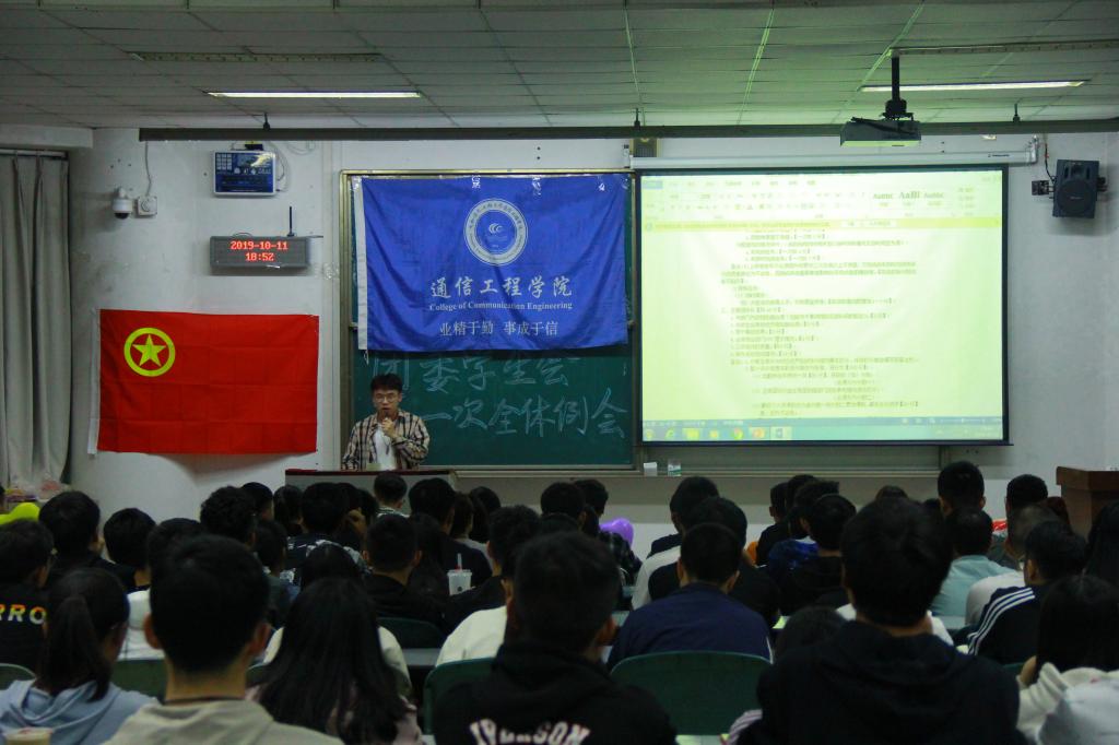 2019年10月11日晚六点半,通信工程学院(微电子学院)团委学生会于4112教室召开第一次全体例会。本次例会旨在加强各部门成员与老师之间的熟悉程度,同时让干事们了解团委学生会的工作模式,更好的融入团委学生会。出席本次会议的有团委老师彭靖涵和团委学生会全体成员。本次会议由体育部干事陈子燃和张含笑主持。