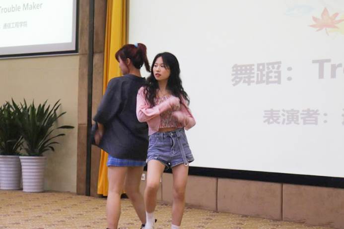 晚会的第一个节目是由通信工程学院的学生上演舞蹈“Trouble Maker”,拉下了晚会的帷幕。两位学生活力四射的步伐和动感的舞姿让台下观众赞叹不已,引燃了现场的气氛。