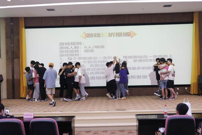 接下来便是通信工程学院的老传统“折报纸”游戏,规则是将报纸平铺在地面,每个学院组成一个小队,参赛队员必须让脚在报纸上且不能接触地面,且保持此状态一段时间,成功的小队得再将报纸对折,然后继续执行此操作,能坚持到最后的小队胜出。同学们积极参与,密切配合,一张张小小的报纸让同学们玩得不亦乐乎。