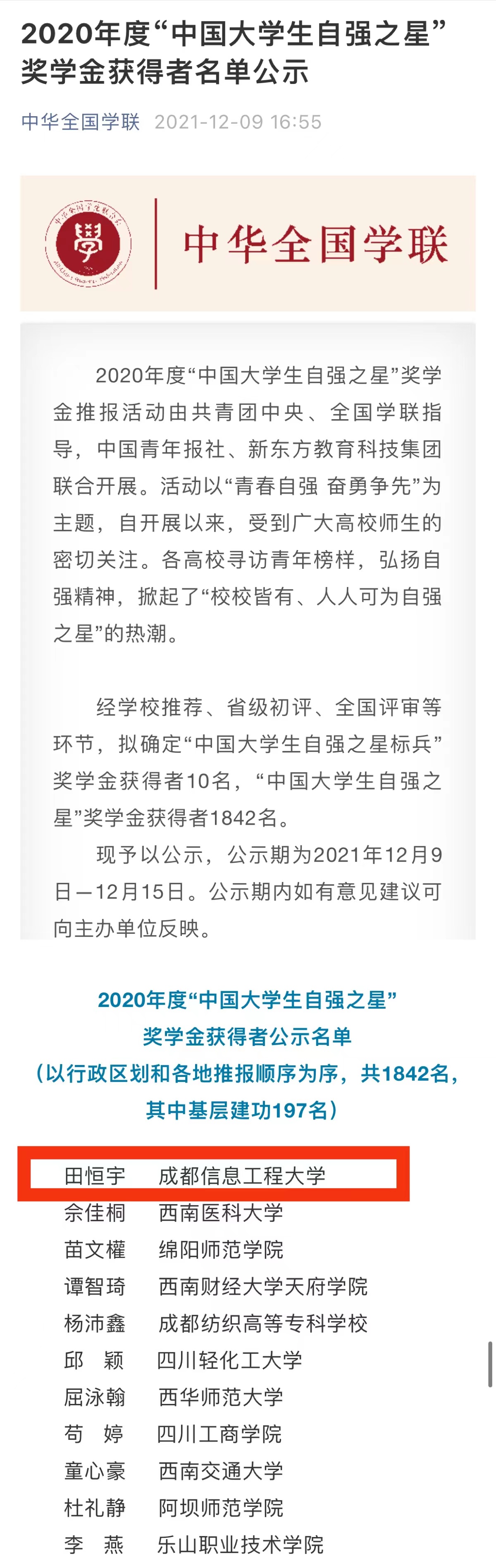 2020年度“中国大学生自强之星”奖学金推报活动由共青团中央、全国学联指导,中国青年报社、新东方教育科技集团联合开展。活动以“青春自强、奋勇争先”为主题,通过各高校寻访青年榜样,弘扬自强精神,掀起了“校校皆有、人人可为自强之星”的热潮。 经学校推荐、省级初评、全国评审等环节,最终确定“中国大学生自强之星标兵”奖学金获得者10名,“中国大学生自强之星”奖学金获得者1842。通信工程学院通信工程专业181班田恒宇荣获“中国大学生自强之星”称号。