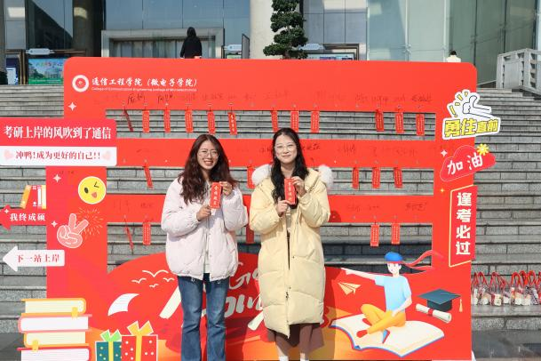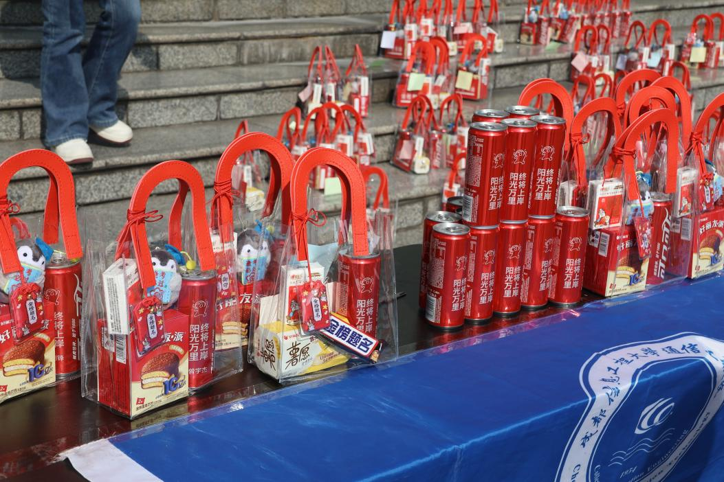 活动现场布置精巧温馨。挂有祝福签的KT板上,“全力以赴”“逢考必过”等标语传递着真挚鼓励;另外还特别为同学们准备了物资丰富、寓意美好的“考研加油包”——印有学号和姓名的定制饮料,祝愿通信学子畅爽开怀、积极迎考,“金榜题名”的士力架激励同学们横扫困难、一战成硕。
