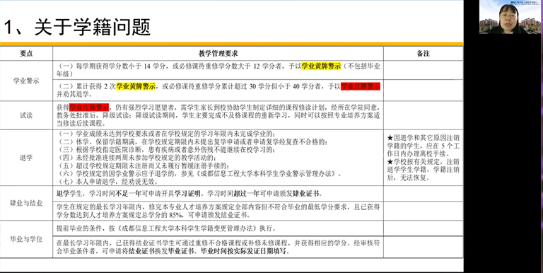 为了尽快让新生熟悉我校教学管理制度,了解学籍学分等相关细则,做好自身学习规划。9月17号上午9点,通信工程学院在腾讯会议上开展教学管理制度与规范讲座,此次讲座由学院党委副书记、副院长薛雅娟组织开讲,2022级全体同学参与。
