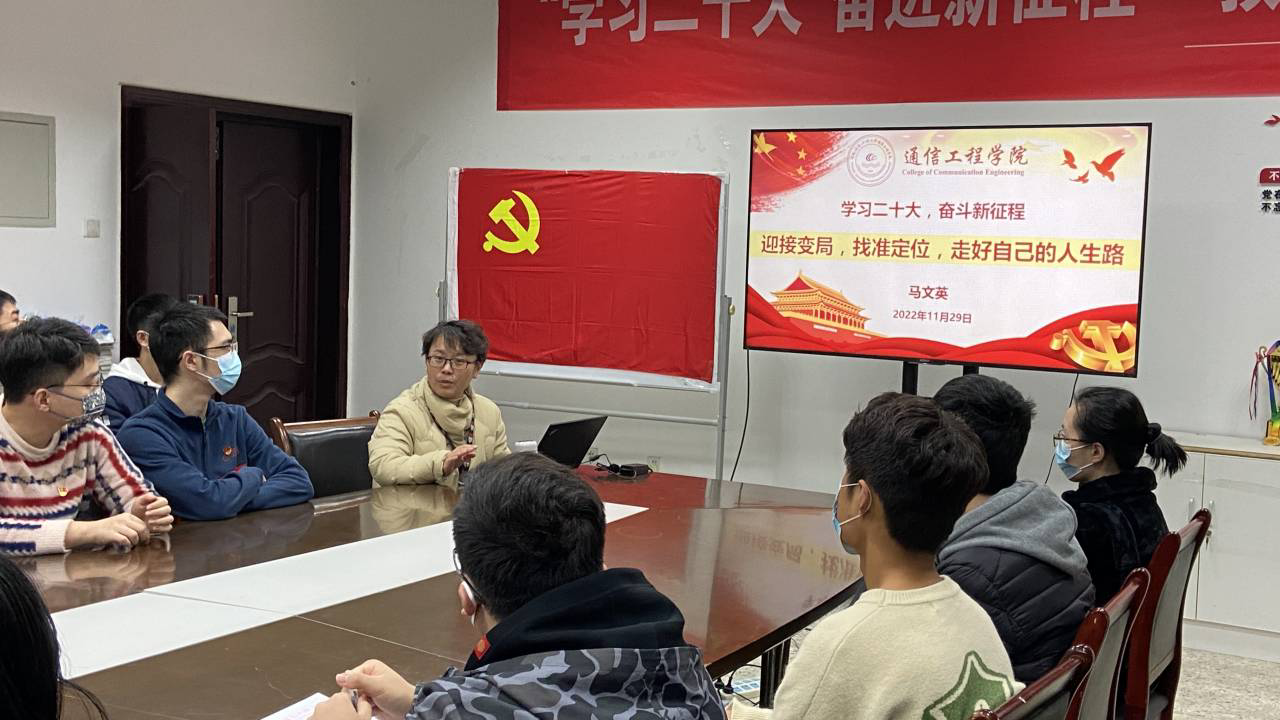 为增强各级组织的凝聚力、向心力、战斗力,加强党性教育、保持党员先进性,通信工程学院(微电子学院)党委于11月29日晚在双中心A603顺利开展“学习二十大,奋进新征程”主题党课。学院党委书记马文英主持活动,第二学生党支部全体党员,2022级、2021级部分班委参加。