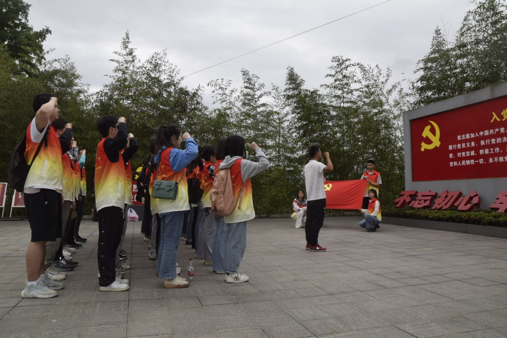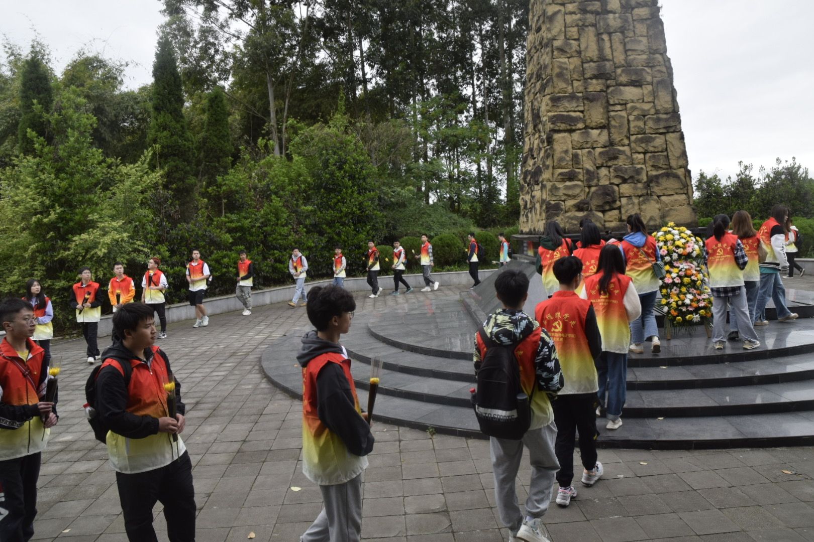 第二站参观成都战役纪念馆。一到纪念馆门口,所有党员便油然而生一种肃穆感。同学们跟随讲解,通过参观历史遗迹、聆听历史故事,深切地感受到老一辈革命者对共产主义的坚定信仰和为解救民族危难而不畏艰难险阻,前赴后继,勇往直前的革命精神。在烈士陵园里,大家聆听着一个个革命战士为争取和平流血牺牲的故事,无不动容,用菊花寄托对革命先烈的哀思,深刻体悟革命先烈们崇高的革命理想、坚定的共产主义信念及为人民谋幸福的人生追求,从而更加坚定“四个自信”,争做优秀共产党员。随后重温入党誓词,不忘初心使命。师生们握紧右拳,庄严宣誓。