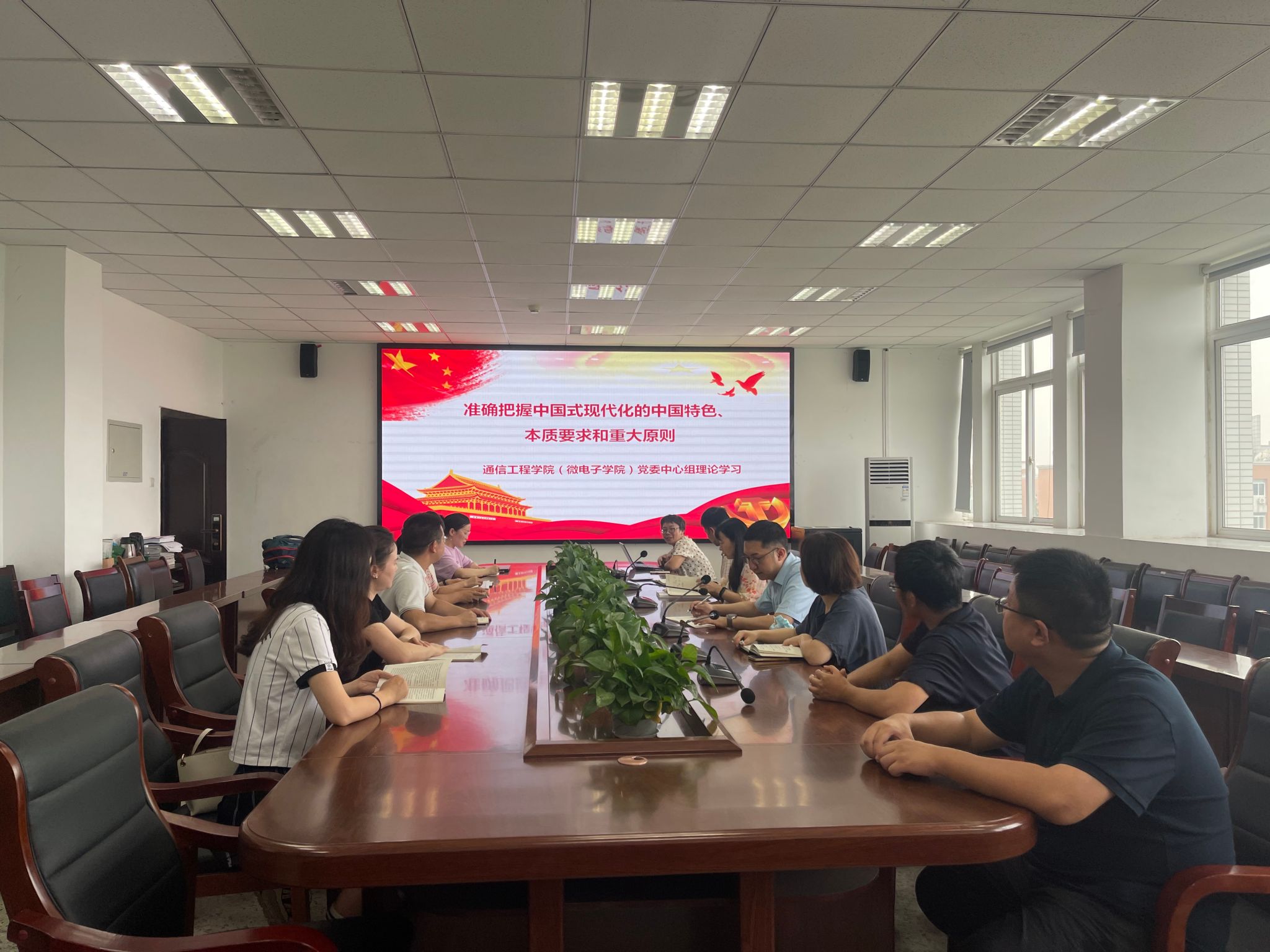 7月26日,通信工程学院(微电子学院)党委理论学习中心组在信达楼A603会议室就“准确把握中国式现代化的中国特色、本质要求和重大原则”开展专题学习。会议由学院党委书记马文英主持,全体党委委员参加,处级党外干部、教师代表列席会议。