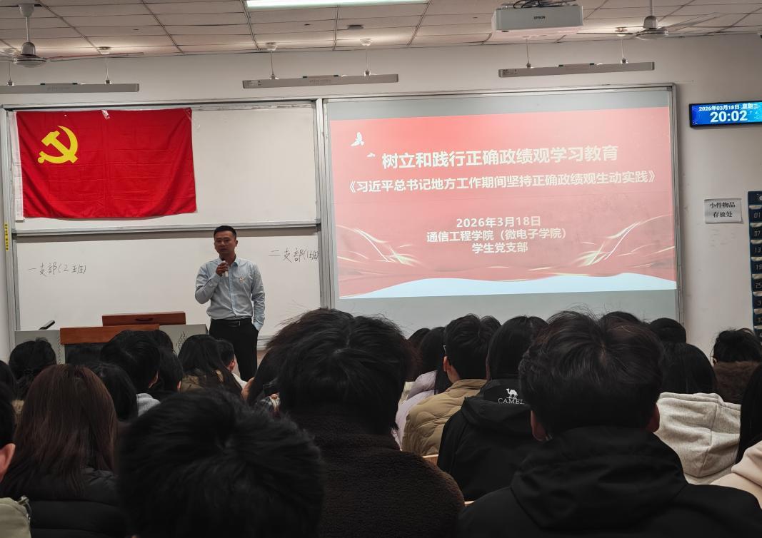 按照《中共成都信息工程大学委员会关于印发〈在全校开展树立和践行正确政绩观学习教育的实施方案〉的通知》(成信党委发〔2026〕26 号)和关于开展树立和践行正确政绩观学习教育的工作提示(一)的相关要求,通信工程学院(微电子学院)学生各党支部于3月18日晚组织“树立和践行正确政绩观学习教育”第一次集体学习,各支部全部党员参加,学院党委副书记刘畅主持并领学。